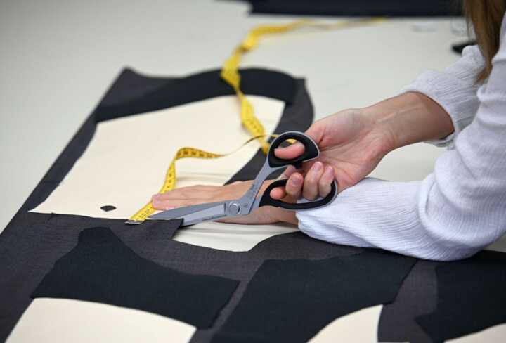 Beschreibung:Auf dem Bild ist eine Person zu sehen, die Stoff mit einer Schere zuschneidet.