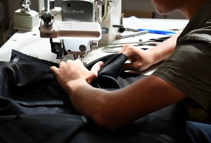 Beschreibung:Eine Person arbeitet an einer Nähmaschine und bearbeitet Stoff.