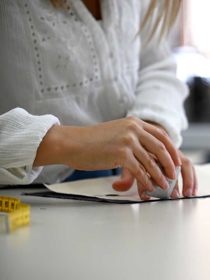 Beschreibung:Die Person auf dem Bild misst und markiert Stoff.