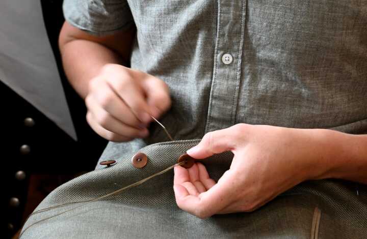 Beschreibung:Auf dem Bild ist jemand zu sehen, der einen Knopf an ein Kleidungsstück näht.