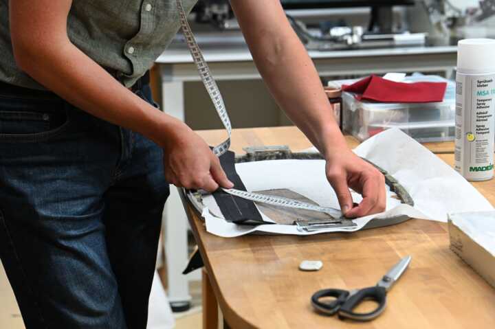 Beschreibung:Eine Person arbeitet an einem Tisch und misst Stoff mit einem Maßband.