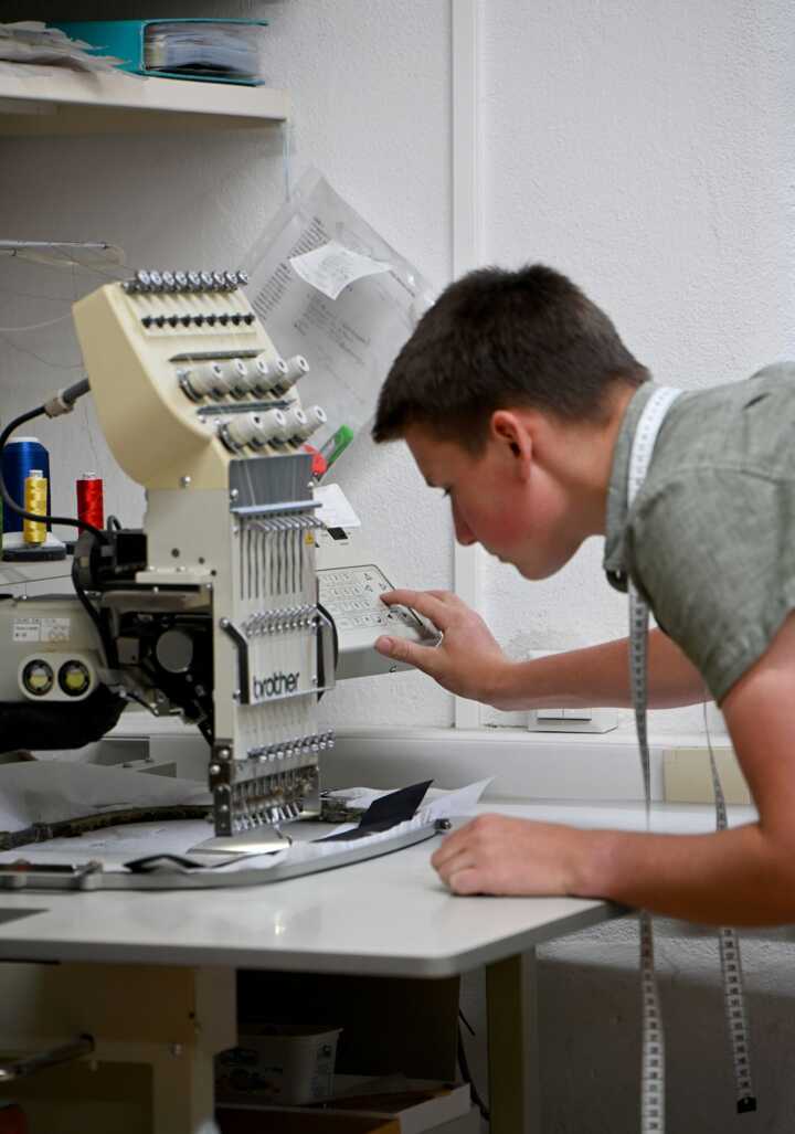 Beschreibung:Ein Mann arbeitet an einer Stickmaschine.