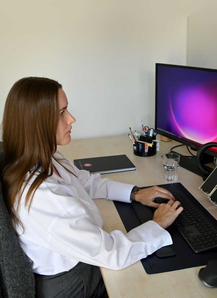 Beschreibung:Auf dem Bild ist eine Person an einem Schreibtisch zu sehen, die an einem Computer arbeitet.