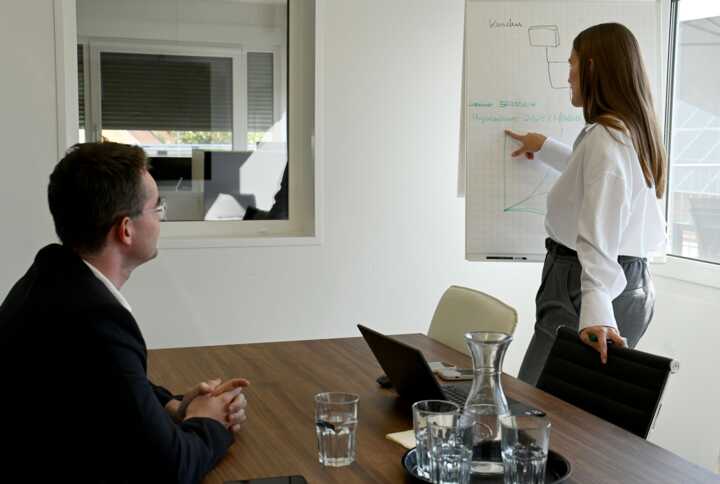 Beschreibung:Auf dem Bild präsentiert eine Person in einem Meetingraum Informationen auf einem Flipchart.