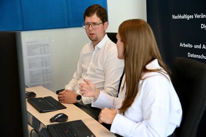 Beschreibung:Das Bild zeigt zwei Personen, die in einem Büro an Computern arbeiten und sich unterhalten.